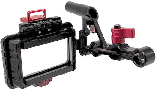The frame secures to the 3.5" LCD monitor of the camera, and your Z-Finder Pro secures into the frame. The frame offers flip-up capability, so you can flip up the Z-Finder Pro when you want to see the camera’s LCD only. The 15mm rod mount attaches to the short rod included with the camera.