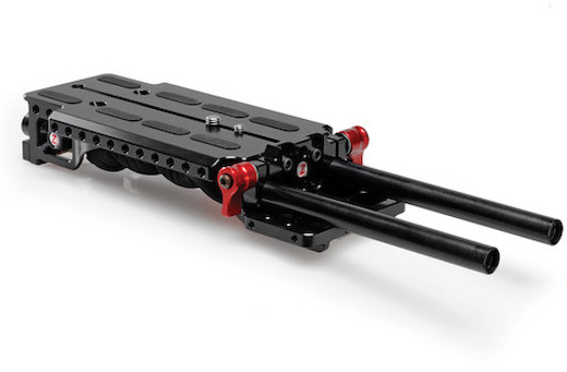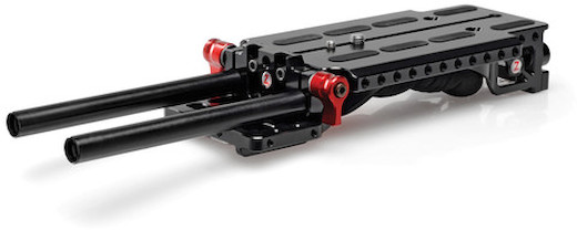 The spring-loaded rod clamps are set far back in the baseplate. This allows you to position your camera further back on the plate, thus keeping the balance point of your rig directly over your shoulder. The sliding track of the rod riser offers 0.87" of vertical adjustment. The riser can also be flipped to offer up to 1.57" of adjustment from the lowest point. The shoulder pad is set as far forward on the plate as possible in order to maximize your accessory capable rod area and help with balance. This baseplate is designed to provide balance and comfort for every camera.