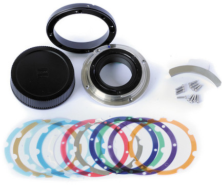 The set includes an EF mount ring, an adaption ring with support bracket, Torx screws, eleven color coded shims and a rear lens cap. As the flange focal distance varies from camera type to camera type, it is sometimes necessary to make adjustments when changing the lens mount or camera model. In order to perform this adjustment, shims in eleven different thicknesses are provided. ZEISS strongly recommends the use of a Torx T6 torque wrench with a torque of 0.4 Nm.