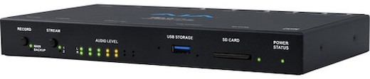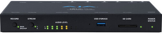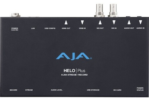 Portable Design, Simultaneous Recording. The AJA HELO Plus is a compact, portable, stand-alone device that allows for simultaneous recording while shooting a game, recording a news broadcast, filming your webcast of the week, and so much more. This streamer & recorder allows you to stream to two destinations and record up to 1080p60 video to local SD card storage, USB storage or NFS/CIFS network storage. The stream and record buttons are placed on the front panel of this device, where you’ll also find a USB port, SD card slot, and an LED screen to check video and audio level indicators.