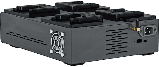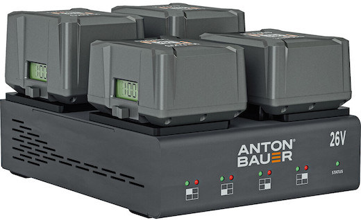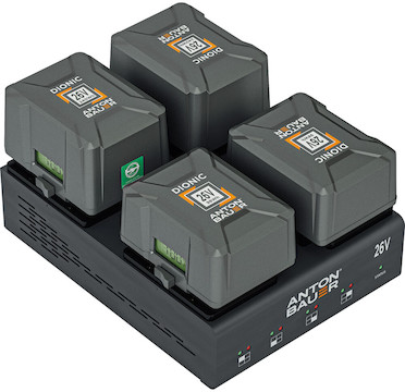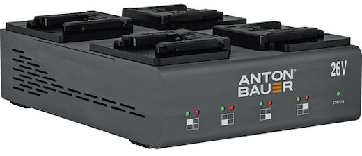 The Anton Bauer Dionic 26V LP4 Quad B-Mount Charger simultaneously charges up to four Dionic 26 or 14.4V B-mount batteries, prioritizing the battery with the strongest charge so you’ll have a fully charged battery in the shortest possible amount of time. If you’re only charging a single Dionic 26V 98Wh B-mount battery, it will max out in only 1.5 hours. The charger features LED lights that indicate the charging progress of each battery individually and a USB port that allows you to update the charger’s firmware via a flash drive.