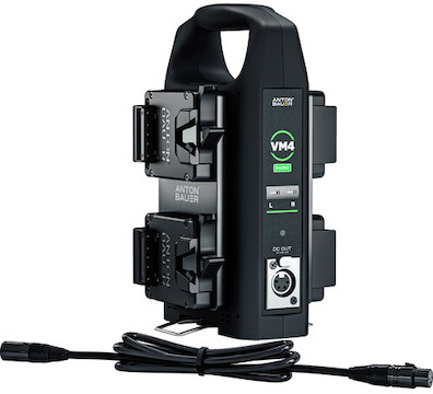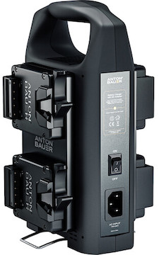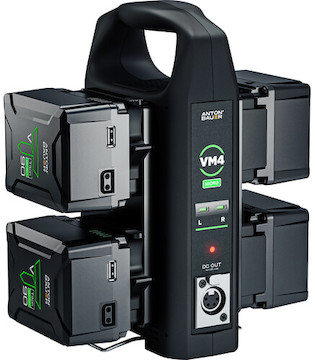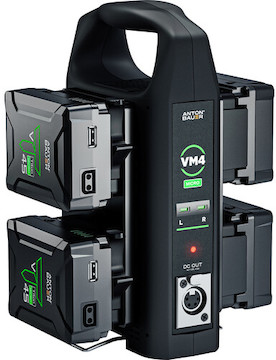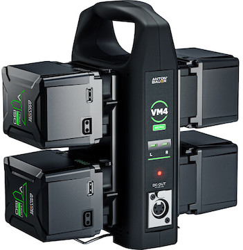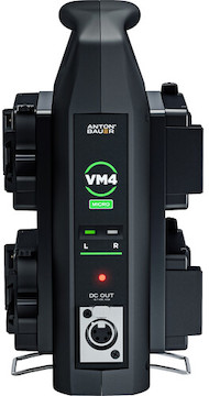 The Anton Bauer VM4 Quad V-Mount Micro Battery Charger lets you quickly, simultaneously charge four high-capacity V-mount Micro batteries or two regular-size V-mount batteries while powering another device. Key features include: