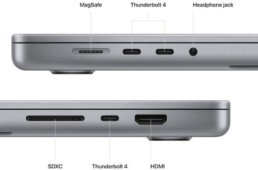 Pro Ports. Just like its predecessor, the M2 Max MacBook Pro includes a wide range of inputs and outputs: three Thunderbolt 4 ports, all supporting 100 W power delivery; one HDMI output that supports 8K displays at 60 Hz or 4K displays at 240Hz; MagSafe 3, a magnetic charging port that, when used for power, charges the MacBook to 50% in just 30 minutes; a 3.5mm headphone jack; and a UHS-II SD card slot.