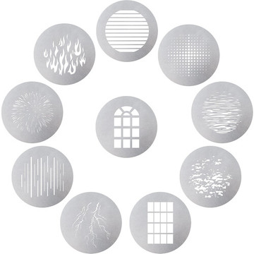 The Aputure Spotlight 10-Piece Gobo Kit is designed for use with the projection attachment for the Aputure Spotlight Mount Set with 26° Lens and Aputure Spotlight Mount Set with 36° Lens. It lets you use lights outfitted with the Spotlight to project B-size, 3.4-inch, patterns or images, and includes Fireworks, Linear, Dot, Church Window, Modern Window, Fire, Scatter, Lightning, Ripple, and Grille gobos.