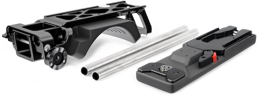 This ARRI AMIRA Cine Support Accessory Kit adds a first party shoulder pad with 15mm rod mounts, two 12-inch Wooden Camera support rods, and dual ARRI-standard rosette mounts to an ARRI AMIRA camera. It also features a VCT wedge mount and the rental includes a VCT adapter plate for quick tripod mounting.