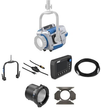 The ARRI Orbiter LED Set with 30° Lens is a powerful, tuneable color light system complete with a manual yoke, a 60° lens, a control panel, and 4-way barndoors. Key features include: