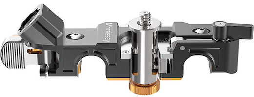 The Bright Tangerine 15mm LWS Lens Support with 1/4"-20 Post rigidly supports your lens on 15mm rods. It includes a removable 1/4"-20 post that attaches to the center of the support and supports the lens to reduce its load, and it can be vertically adjusted by up to 18mm to accommodate a wide range of lenses. The support features two 3/8″ anti-twist accessory ports and a quick-release lever for ease of use.