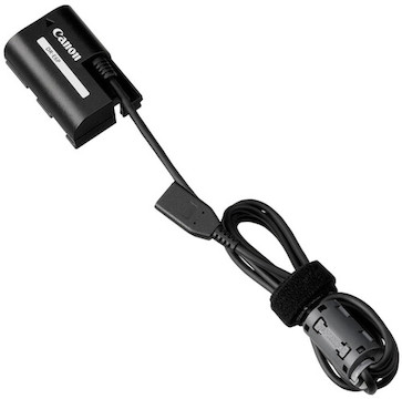 The Canon DR-E6P DC Coupler powers your Canon EOS R5 Mark II using an external power source, like the Canon PD-E2 USB Power Adapter.