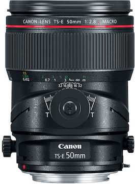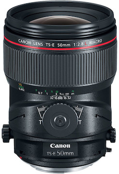 Normal-Length Perspective-Control Tilt-Shift Lens. The Canon TS-E 50mm f/2.8L Macro is a normal-length perspective-control tilt-shift lens that’s ideal for product, tabletop, architectural, and interior photography. It gives you up to +/- 8.5° of tilt for focus control and up to +/- 12mm of shift to adjust composition and perspective, and its tilt-locking mechanism provides added stability when shooting. Its 10.6-inch minimum focusing distance and 0.5x maximum magnification give you great depth-of-field control when photographing close-up subjects.