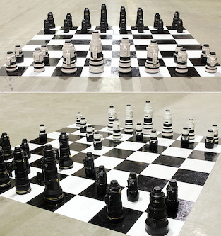 The complete 32 piece set includes 70-200 f/2.8 pawns, 600mm f/4 Kings and 500mm f4 Queens, 400mm f/2.8 Bishops, 300mm f/2.8 Knights, and 200mm f/2.0 Rooks in black (Nikon) and white (Canon). If you don’t already have an appropriate size chess board we will throw in a complete set of 32 white and 32 black stick-on 12" square vinyl tiles so you can create your own.