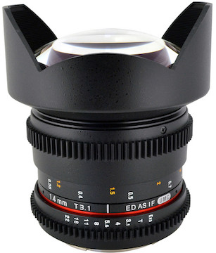 The Rokinon 14mm T3.1 Cine is an ultra-wide angle lens that’s been optimized for video use. It features geared manual focus and stepless aperture rings, allowing out-of-box compatibility with industry-standard follow focuses. It has clearly labeled depth of field markings for simplifying focus pulls, offering a minimum focus distance of 11.02".