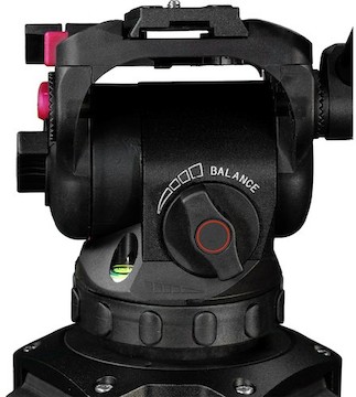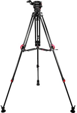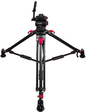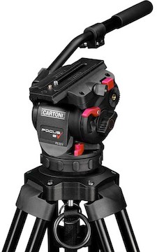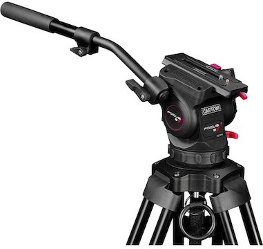 The Cartoni Focus 8 Red Lock Tripod System consists of a Focus 8 Fluid Head and a Red Lock 3-Tube Aluminum Tripod. Key features include: