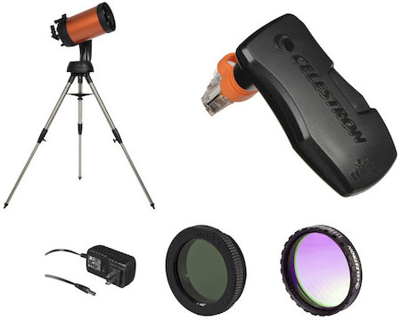 Included Support. Along with the telescope and mount, you get a stainless steel tripod with a tray attached to hold things like eyepieces and filters. You also get an AC adapter but you can always power the telescope with eight AA batteries (batteries not included) if AC power isn’t nearby. The eyepiece has a 1.25-inch barrel and 25mm focal length which produces 81x magnification. You also get a 1.25-inch, 90-degree eyepiece that offers much better comfort when observing at or near the zenith (essentially for viewing directly above you). That’s not all – included in this kit is a Moon filter for when it’s a particularly bright night, a high-contrast, light-pollution-cutting filter, and the SkyPortal Wi-Fi module for converting a smart device into a controller.
