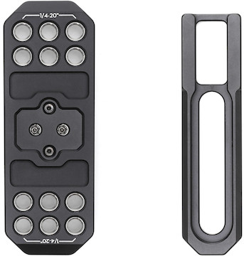 The DJI Ronin 2 Top Accessory Mounting Plate allows you to adapt a Ronin 2 top cross bar camera mount to the cold shoe of popular cinema cameras like the Canon EOS C300 Mark II for maximum stability and features four rows of 1/4"-20 insets for mounting accessories. This plate is compatible with the standard cross bar included with our Ronin 2 kits and the DJI Extended Top Cross Bar for Ronin 2 (not included).