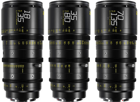 The DZOFilm Catta Ace Full Frame Zoom 3-Lens Kit (EF) is a set of EF-mount cinema zoom lenses across a broad range of focal lengths that are compatible with cameras using up to full-frame sized sensors.