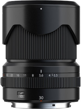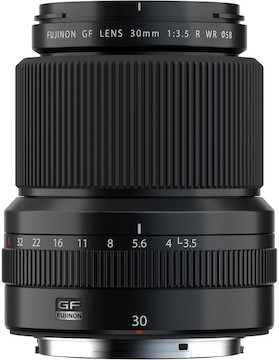 Versatile Wide-Angle Prime. With its 24mm equivalent focal length, wide field of view, and f/3.5 minimum aperture, the Fuji GF 30mm f/3.5 R WR is an excellent choice for everyday shooting, landscapes, street photography, group portraits, and architecture. Its rounded nine-blade diaphragm helps to produce pleasing bokeh.