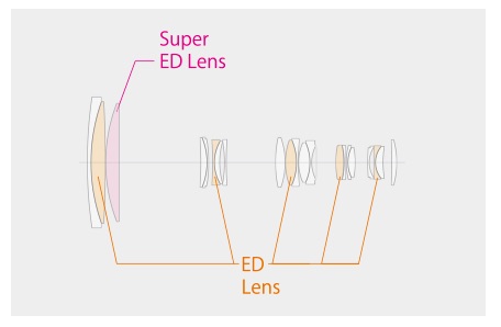 Optics. The 14-group/21-element optical formula offers a combination of five ED elements and one Super ED element to minimize chromatic aberrations and fringing throughout the zoom range.