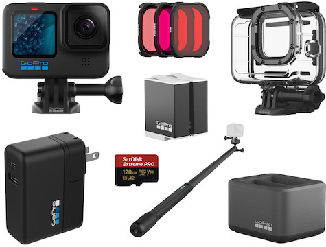The GoPro HERO11 Underwater Kit consists of a GoPro HERO11 Black, three filters, protective underwater housing, extension pole, three batteries, a charger, and a supercharger. Key features include: