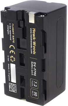 The Hawk Woods DV-F790 – like its smaller and larger siblings (DV-F590 and DV-F990) – is a Sony NP-F (L-Series) battery alternative, and all three models are delightfully dense in the context of their peers. The DV-F790, which is about half the size of Sony’s NP-F970, houses an impressive 6800mAh (50Wh) of energy in lithium-ion cells – that’s just a bit more than the capacity found in a Sony NP-F970.