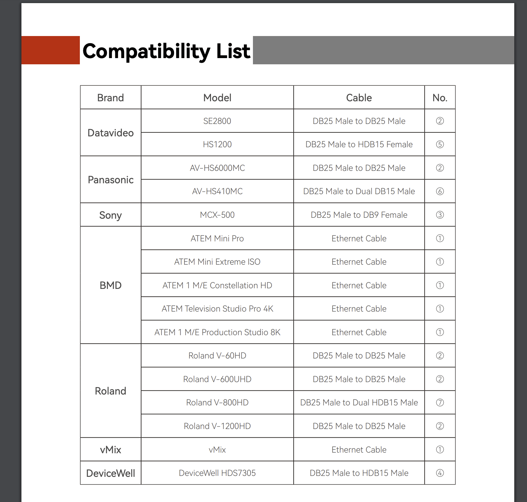 Our inventory of compatible switchers includes the Sony MCX-500, Blackmagic Design ATEM Mini Pro, Blackmagic Design ATEM Mini Extreme ISO, Blackmagic Design ATEM 1 M/E Constellation, Blackmagic Design ATEM Television Studio Pro 4K, Blackmagic Design ATEM 1 M/E, and Roland V-60HD.