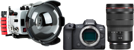 The Ikelite Canon R5 Underwater Camera Kit is a full-frame mirrorless camera, 15-35mm lens, and underwater housing combo that’s waterproof down to 200 feet. Key features include: