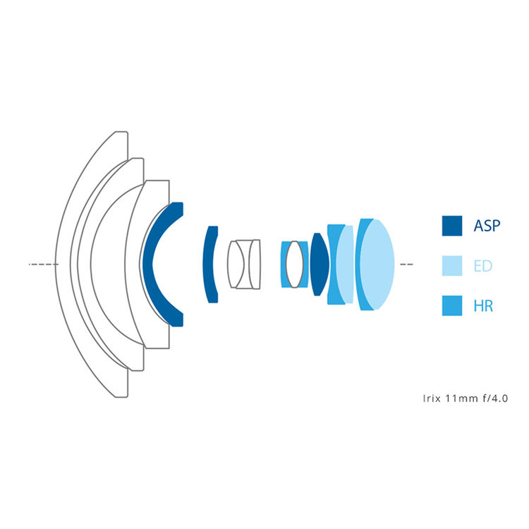Advanced Optics. The Irix 11mm f/4 Blackstone’s sixteen-element/ten-group design includes three aspherical elements, four high-refractive index elements, and two extra-low dispersion elements that control distortions and aberrations while retaining sharpness and clarity at any focus distance. The Neutrino coating controls ghosting and flare for a color-neutral image.