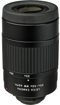 The Leica 25-50x WW Aspheric Eyepiece for Televid is an accessory eyepiece for the Leica APO-Televid 82 Spotting Scope. It offers 25-50x magnification and an expanded field of view. Key features include: