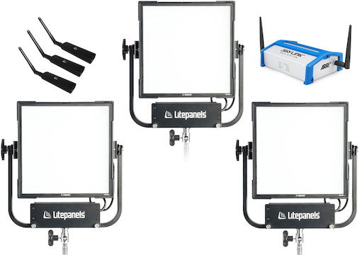 The Litepanels Gemini 1×1 RGBWW LED 3-Light DMX Kit is a professional lighting kit meant for creating a wireless DMX studio environment. This package includes the basics you would need to build a 3 light setup where all functions can be remotely adjusted via DMX or LAN connections. The ARRI SkyLink Base Station uses LumenRadio technology to enable wireless single-universe DMX512 control over the Gemini fixture’s wired DMX ports and the included Litepanels Wireless DMX Communications Modules. The basestation can communicate with CRMX devices from up to 1,640 feet and Wi-Fi devices from up to 246 feet. Click on any of the items below for more information.
