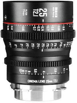 Cine Camera Solution. The Meike 25mm T2.1 Super 35 Cine (Canon EF) is an EF mounted lens perfect for capturing 6K resolution. This lens contains a 33.6mm image circle for coverage of Super35 sensors cameras, cine-standard 0.8 MOD focus for compatibility with follow focus and iris controls, iris gears, and an 9-blade iris for smooth bokeh. The Meike 25mm T1.2 also features multiple coatings for minimal ghosting and flaring, and it offers 270° of focus barrel rotation. For easier focus pulls, the focus scales are marked in both feet and meters on both sides of the lens barrel.