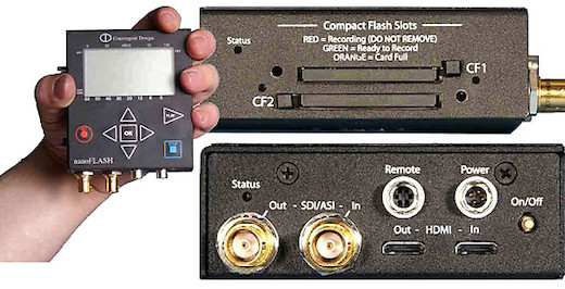 The nanoFlash includes both HD/SD-SDI In and Out as well as HDMI In and out. The HD/SD-SDI connections are made via a standard BNC connector, while the HDMI I/O uses the new type C mini-HDMI connector. Video and audio are recorded to Compact Flash cards. According to the manufacturer, the included battery pack will last up to 3 hours, depending on load.