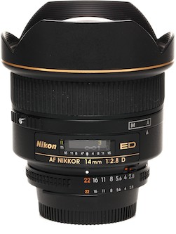 The used Nikon 14mm f/2.8D ED AF is a very sharp, ultra wide-angle rectilinear prime lens. Key features include: