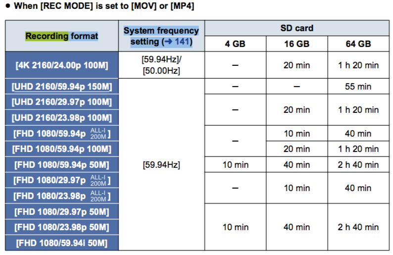 4096 × 2160 – 24.00p, 3840 × 2160 – 59.94p, 29.97p, 23.98p, 1920×1080 – 59.94P, 59.94i, 29.97p, 23.98p, 1440 × 1080 – 59.94i, 1280×720 – 59.94p, 720×480 – 59.94i, and Variable Frame Rate Mode: 2 to 120 FPS over 59.94p, 29.97p, 23.98p base
