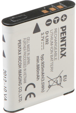 The Pentax D-LI92 Rechargeable Li-Ion Battery is a high-capacity rechargeable battery for the Ricoh WG-80 Digital Camera. It features No Memory Effect, which lets you recharge partially drained batteries without affecting runtime.