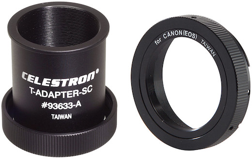 This T-Mount to Canon EF Adapter mounts to your Celestron NexStar 6SE 150mm f/10 Telescope to view and capture the outer world with a Canon EF-Mount camera, like the Canon 5D Mark IV. The T-Mount adapter threads to the telescope while a pre-attached Canon EF T-Ring clicks right onto your camera like a lens. Please note that it is only recommended to use DSLR or Mirrorless cameras with the T-Ring, as cinema cameras will be too large to attach to the telescope.