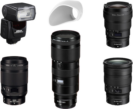 The Premium Wedding Kit for Nikon Z offers a fast, versatile lens package and provides the components needed for low light shooting, group shots, macro-detail work, or those farther away shots that require the perfect zoom lens. Click on any of the highlighted items below for more information.