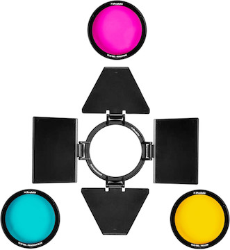 The Profoto Clic Barndoor with Creative Gels is a kit designed to shape, filter, and alter the light from Profoto’s A-series flashes. Key features include: