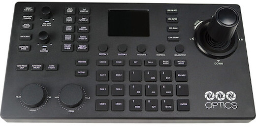 Professional PTZ Camera Control. The PTZOptics PT-SUPERJOY-G1 Controller enables joystick and button control to up to 28 PTZ cameras, in four groups of seven cameras each, using NDI, IP, or serial connections. This controller offers support for NDI, VISCA, VISCA-over-IP, Pelco-P, and Pelco-D protocols over IP and serial RS-232, RS-422, and RS-485 communication. With all of these connections, you’re able to easily control the speed of your pan, tilt, zoom, and lock moves.