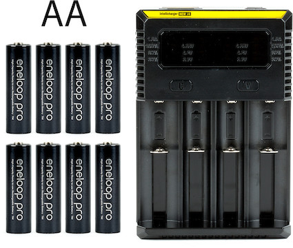 The Rechargeable AA Battery 8-Pack Travel Kit bundles eight rechargeable AA batteries with a four-battery charger inside a soft travel case for power-hungry shoots. Here’s what you get: