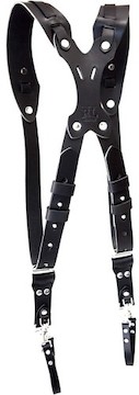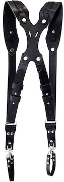 The RL Handcrafts Clydesdale Pro Large Black Camera Harness is a handcrafted genuine leather harness designed to comfortably hold up to 3 DSLR cameras and keep your hands free. Key features include: