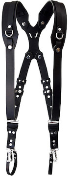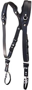 The RL Handcrafts Clydesdale Pro Medium Black Camera Harness is a handcrafted genuine leather harness designed to comfortably hold up to 3 DSLR cameras and keep your hands free. Key features include: