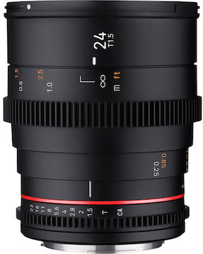 The Rokinon 24mm T1.5 Cine DSX is a fully manual wide-angle cine prime designed for Canon EF-mount cameras. Key features include: