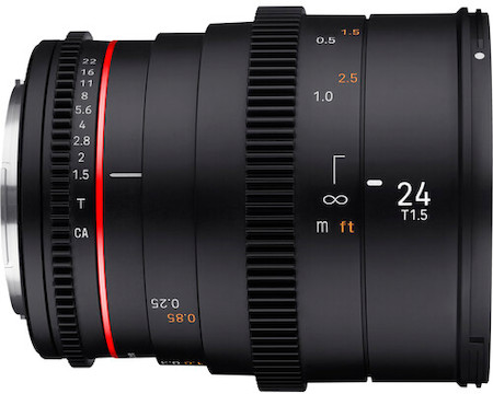 The Rokinon 24mm T1.5 Cine DSX is a fully manual wide-angle cine prime designed for Sony E-mount cameras. Key features include: