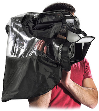 The Sachtler SR425 Rain Cover is open on the bottom, so you can use a shoulder strap or mount to a tripod.