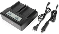 Featuring two L-series NP-F980 battery plates and an LCD screen that shows battery charging status, the charger provides 1.5A when a single battery is in the charger and 0.8A per battery when two batteries are charging simultaneously. A pre-charging function helps extend battery life. Also featured is a USB output that provides 5V, 2100mA to a smartphone or small device while the charger is plugged into an AC source. A wall AC power cable is included in the package.