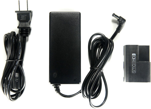 This rental includes a standard 12V-2A power supply, which connects to the dummy LP-E6’s barrel connection. This enables continuous power for your monitor.