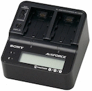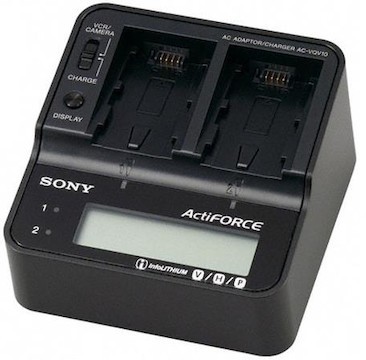 The Sony AC-VQV10 Charger quickly charges two Sony V-, H-, and P-Series batteries. batteries back-to-back.
