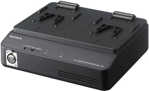 The used Sony BC-L90 V-Mount Battery Charging Station is designed to charge two Sony BP-series V-mount batteries at once.