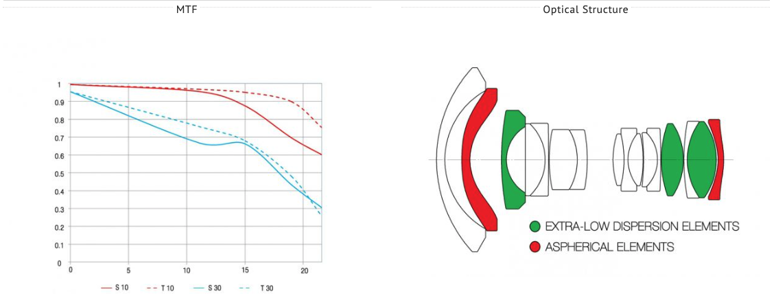 Virtually Distortion-Free. This lens’s rectilinear nine-group/sixteen-element optical design keeps distortion at an absolute minimum. It includes two aspherical elements and four low-dispersion elements which help to eliminate chromatic aberrations and color fringing. The XLD coating keeps the front element clear of dust and moisture, allowing you to work in inclement conditions.