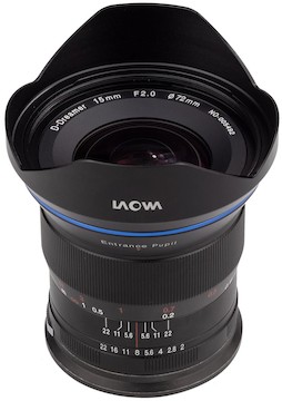 Ultra Wide, Fast Aperture, Close Focus. The Venus Optics Laowa 15mm f/2 FE Zero-D’s f/2 aperture, 110° angle of view, and virtually distortion-free performance make it great for astrophotography and general low-light shooting. Its 72mm filter compatibility means it excels at landscape shooting, while you can use its 6-inch minimum focusing distance and ultra-wide perspective to get great bokeh shots and wide-angle close-ups.