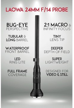 The Venus Optics Laowa 24mm Probe Lens for PL (Cine-Mod) is a long, slender lens designed for macro and video shooting on PL-mount cameras. Key features include: